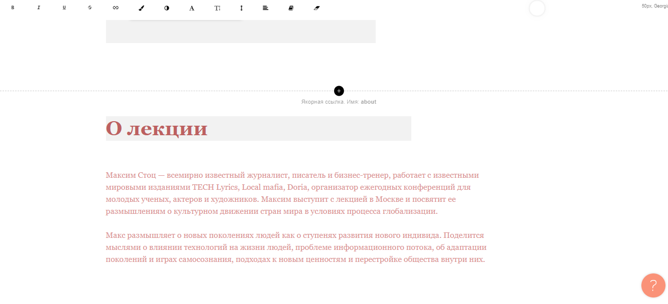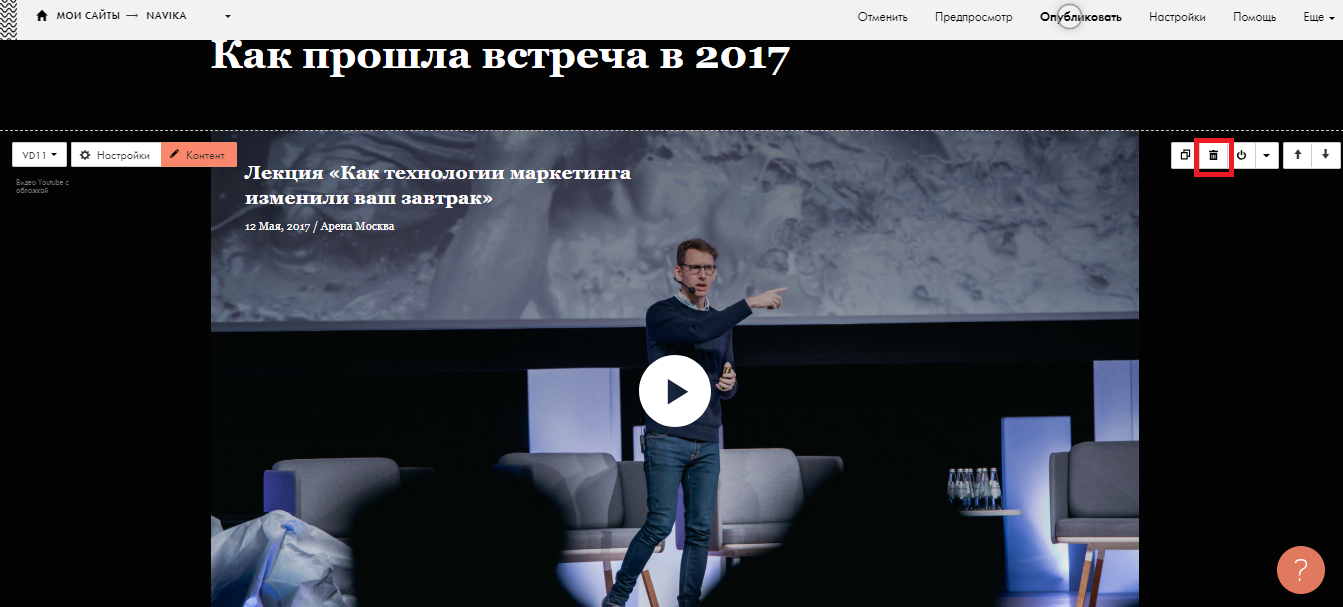 Так как наша лекция состоится впервые, блок «Как прошла встреча в 2017» лучше удалить. Для этого нужно нажать на значок мусорного ведра в правом верхнем углу.