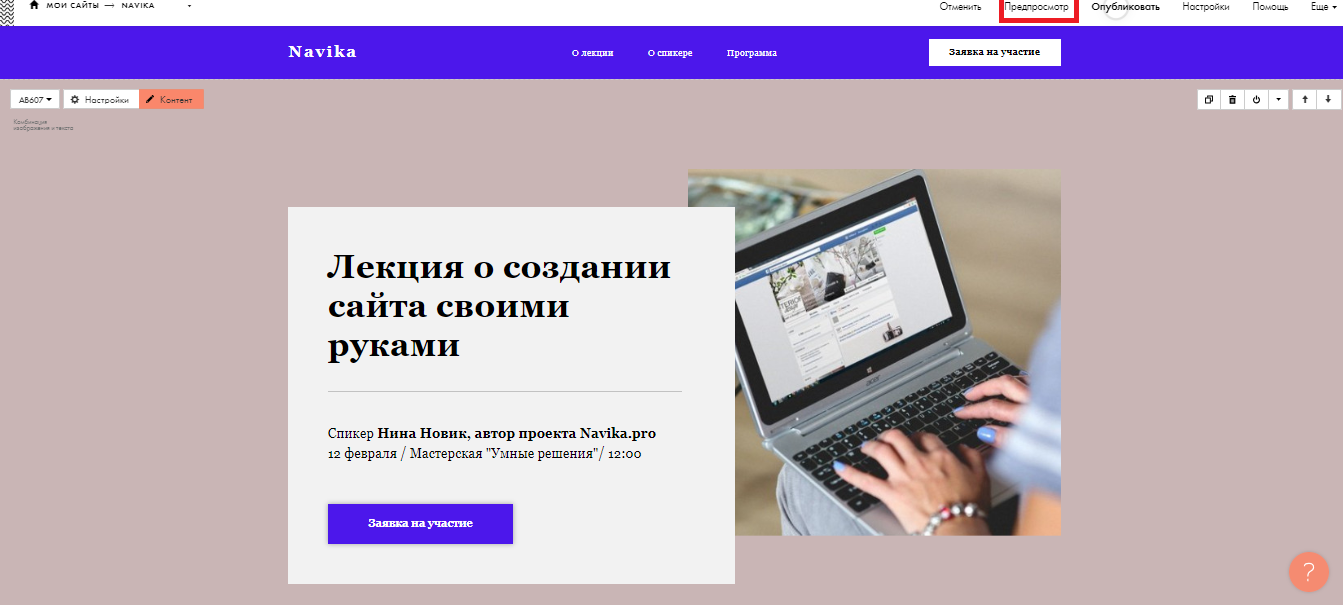 Шаг 8. Когда все блоки заполнены и страница готова к первым посетителям, не торопитесь ее публиковать. Нажмите на кнопку «Предпросмотр» и посмотрите, каким увидят ваш сайт пользователи интернета.