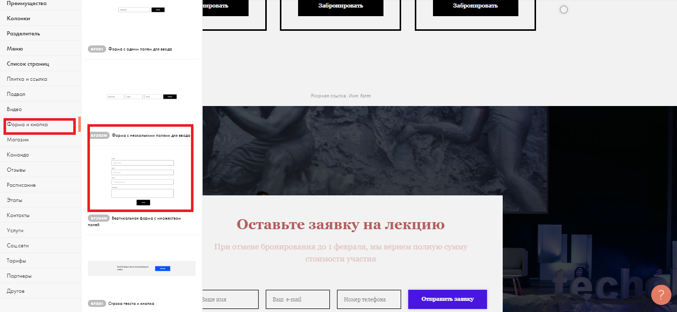 Слева появится библиотека, где можно выбрать нужную категорию и несколько вариантов реализации. Например, мы хотим добавить форму, чтобы посетители могли оставить через нее свои вопросы по теме лекции.