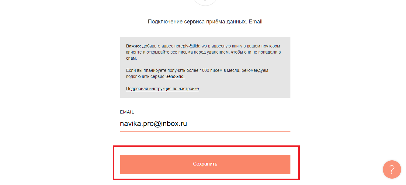Вводим адрес электронной почты, куда будут поступать все письма, и нажимаем на кнопку «Сохранить».