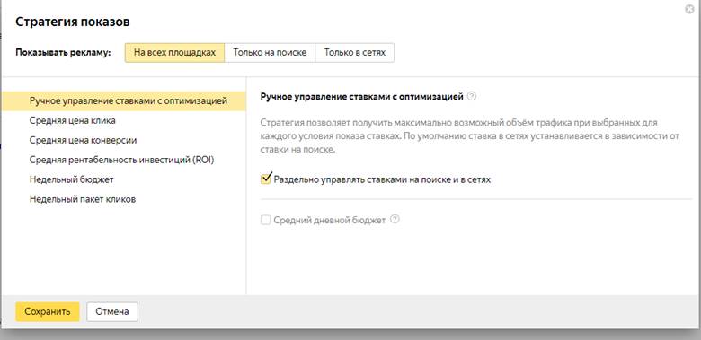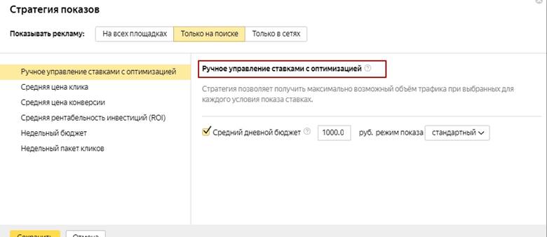Выберите стратегию показа — в поиске, в рекламной сети «Яндекса» или на всех площадках (последний вариант подходит для периода тестирования «ради интереса», тем не менее специалисты считают эту стратегию неэффективной для работы). Обозначьте ручное управление с оптимизацией.