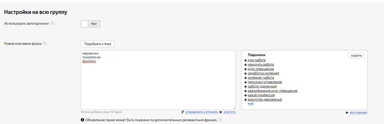 Помните, что слишком широкие запросы без уточнений, слишком широкая аудитория по принципу «мой товар нужен всем» приведут только к тому, что объявление или будет показано по совершенно нерелевантным запросам, или это будет пустое скликивание бюджета.