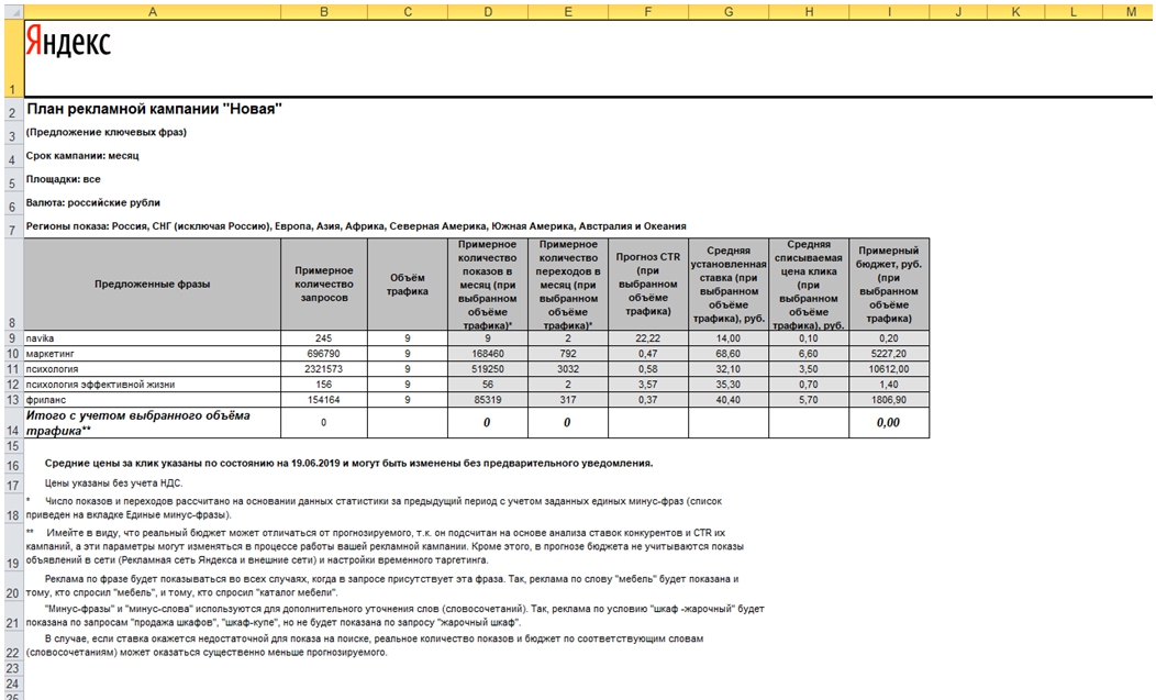 Для того чтобы предварительно посчитать стоимость рекламных расходов, можно использовать сервис «Яндекса» «Прогноз бюджета». Имея в наличии список ключевых слов, по которым вы хотели бы заказывать контекстную рекламу, а также список минус-слов, по которым вы ограничиваете показы, вы можете спрогнозировать свой бюджет на рекламу.