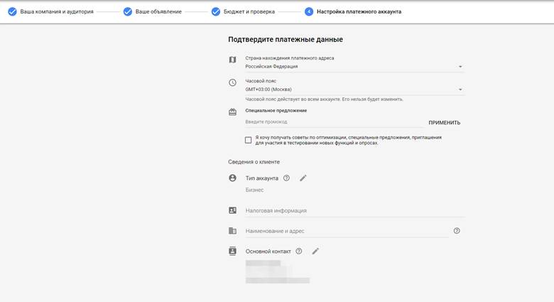 Заполняете все необходимые данные аккаунта, устанавливаете бюджет, настраиваете платежный аккаунт и отправляете объявление на модерацию.