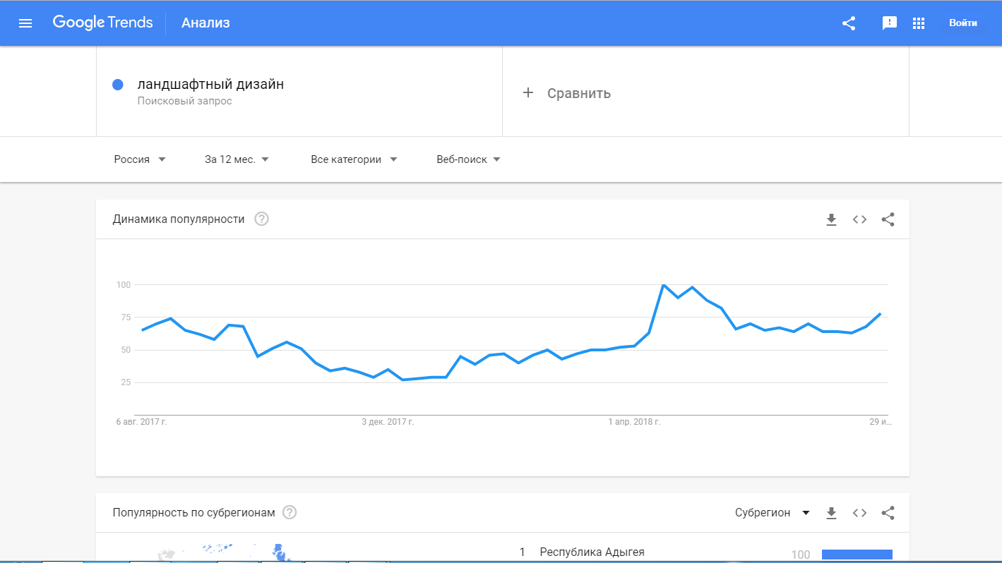 Предположим, вы занимаетесь или планируете заняться ландшафтным дизайном. Давайте посмотрим, насколько услуга интересует людей и когда имеет смысл платить за активную рекламу этой услуги. Начнем с того, что оценим популярность запросов по ландшафтному дизайну в зависимости от сезона.