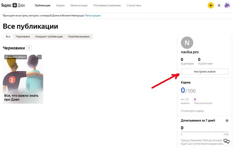 Именно здесь будут располагаться все ваши публикации, тут вы увидите основные показатели развития канала, здесь появится первая заработанная вами сумма. А сейчас необходимо ваш канал настроить.