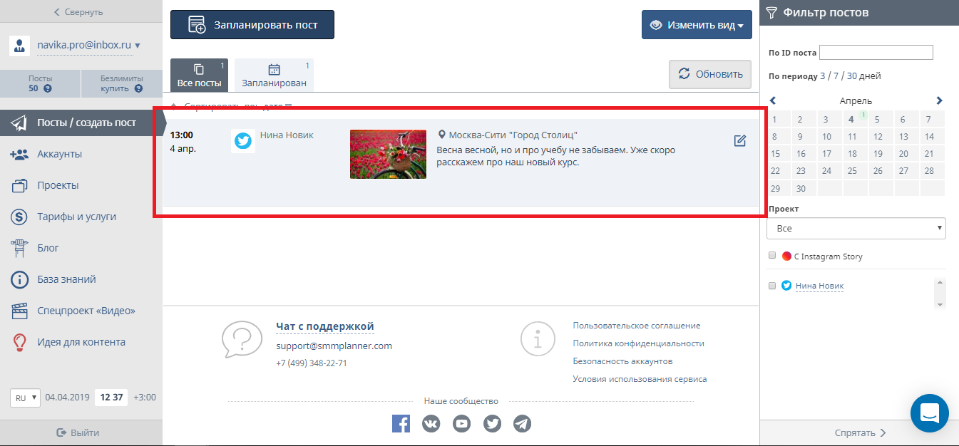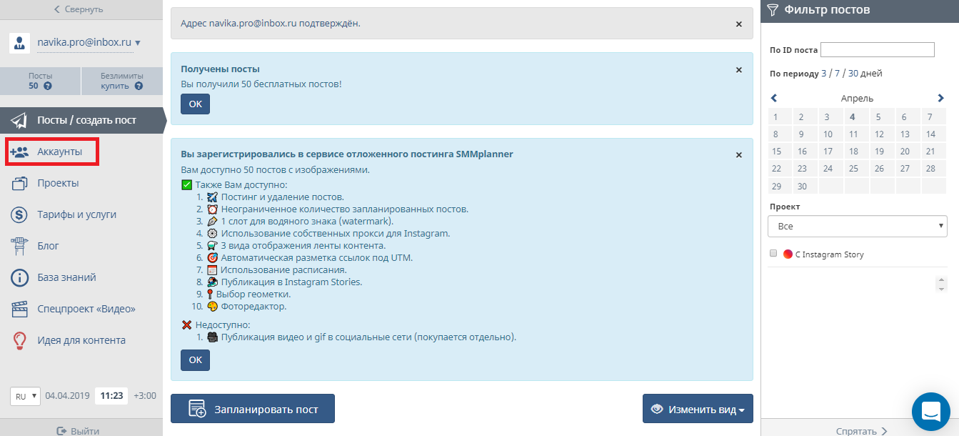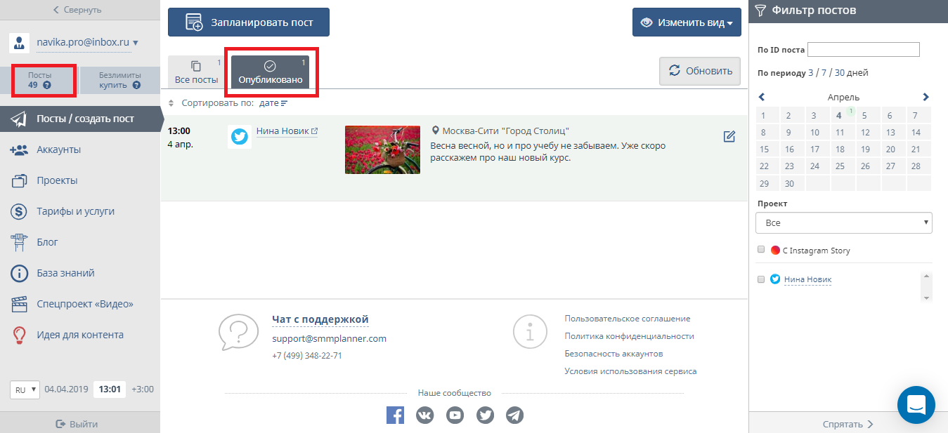 В кабинете SMMplanner наш пост теперь помечен, как опубликованный. И еще осталось 49 бесплатных постов для пробного периода.