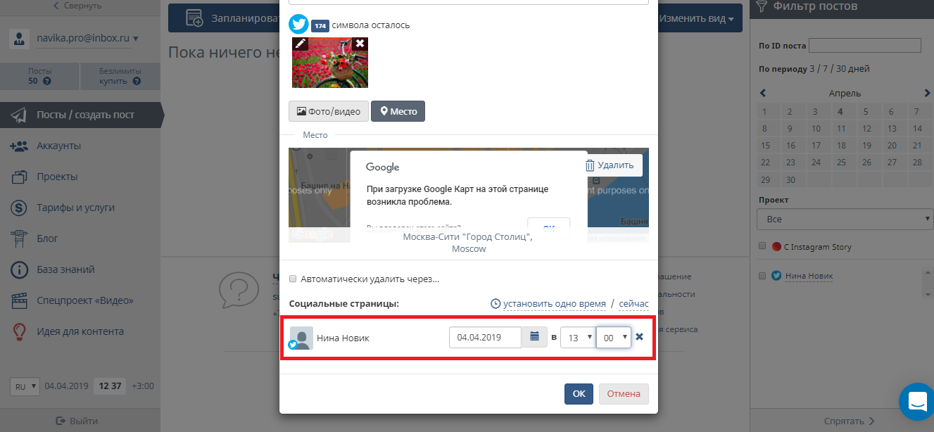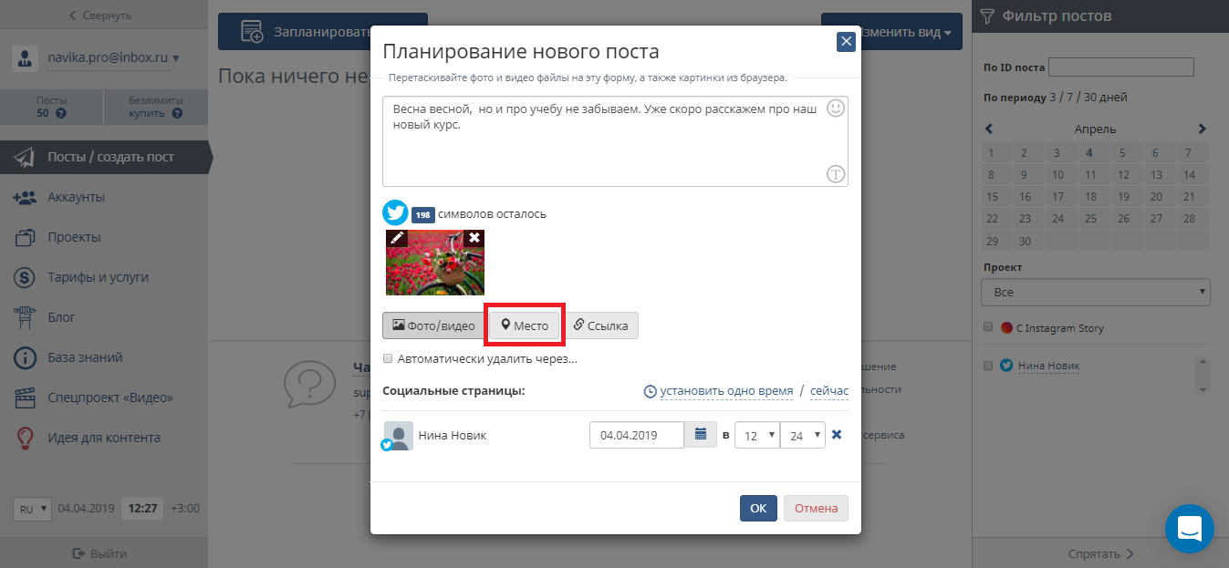 Теперь выбираем страницу социальной сети, где должен быть опубликован пост. Указываем дату и точное время публикации. После чего нажимаем на кнопку «ОК».