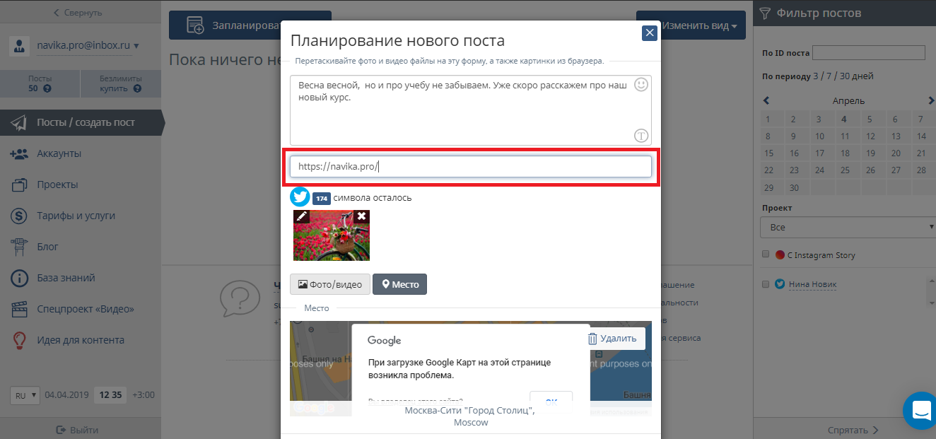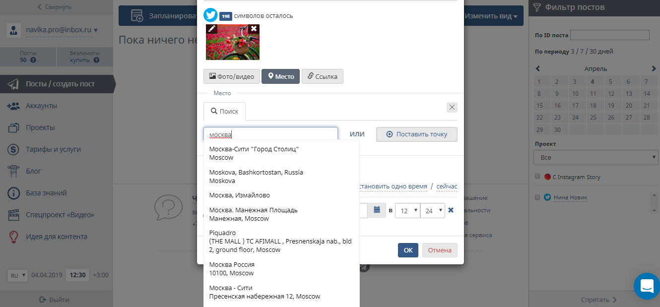 Стоимость: бесплатный 7-дневный период, дальше вы платите 400 рублей в месяц за подключение одного аккаунта каждой соцсети и 100 рублей за дополнительный аккаунт.