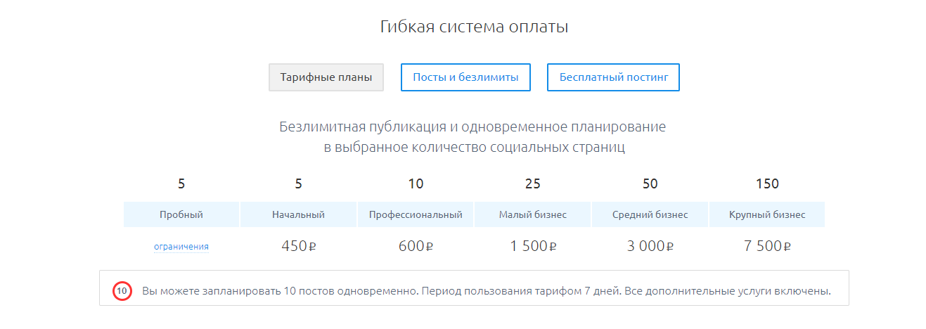 Опробовать SMMplanner бесплатно можно в течение 7 дней. Правда, с небольшим ограничением — одновременно можно запланировать не более 10 постов. После нужно будет выбрать тариф, который подойдет вашим потребностям и масштабу бизнеса. Но даже самый дорогой пакет услуг обойдется дешевле, чем найм помощника.
