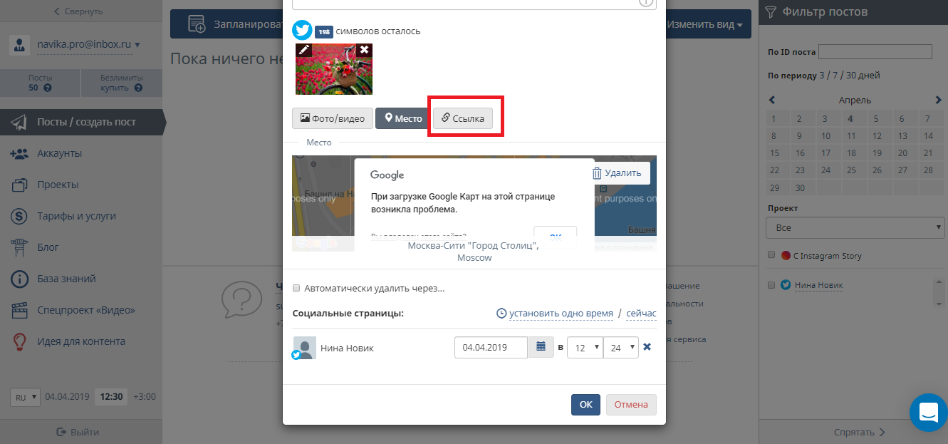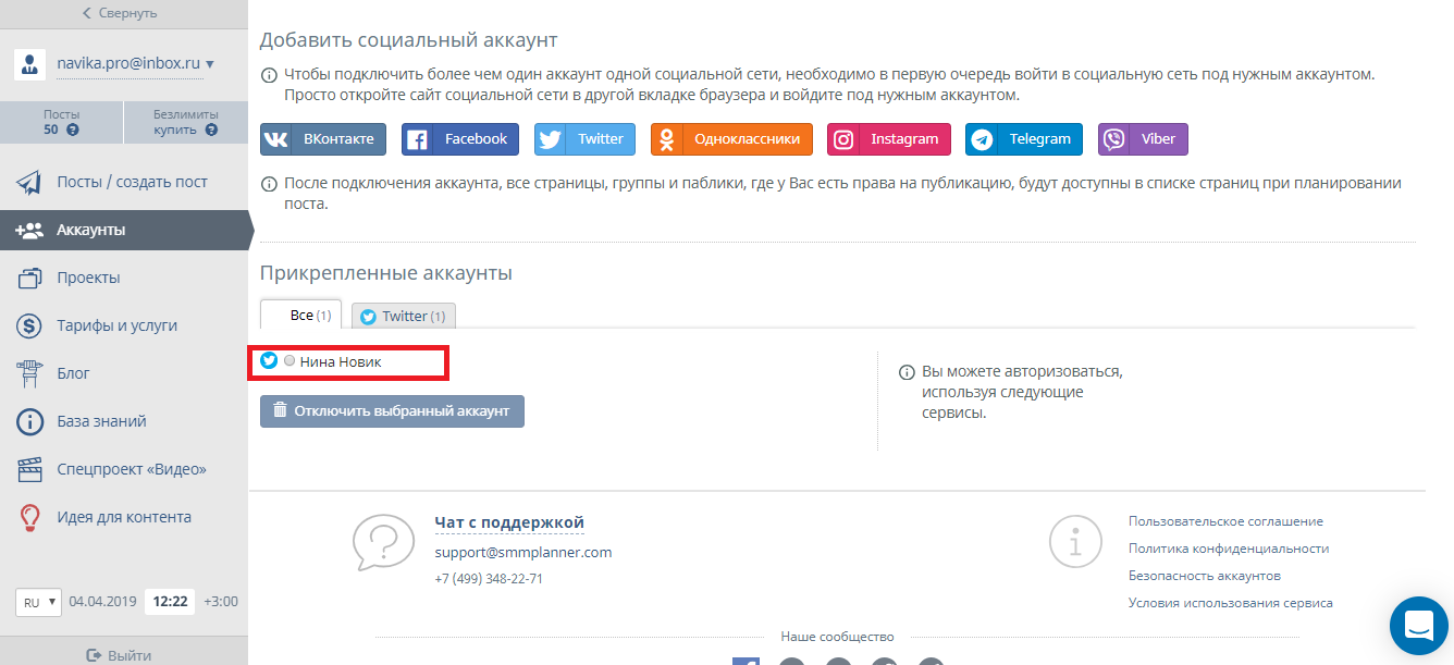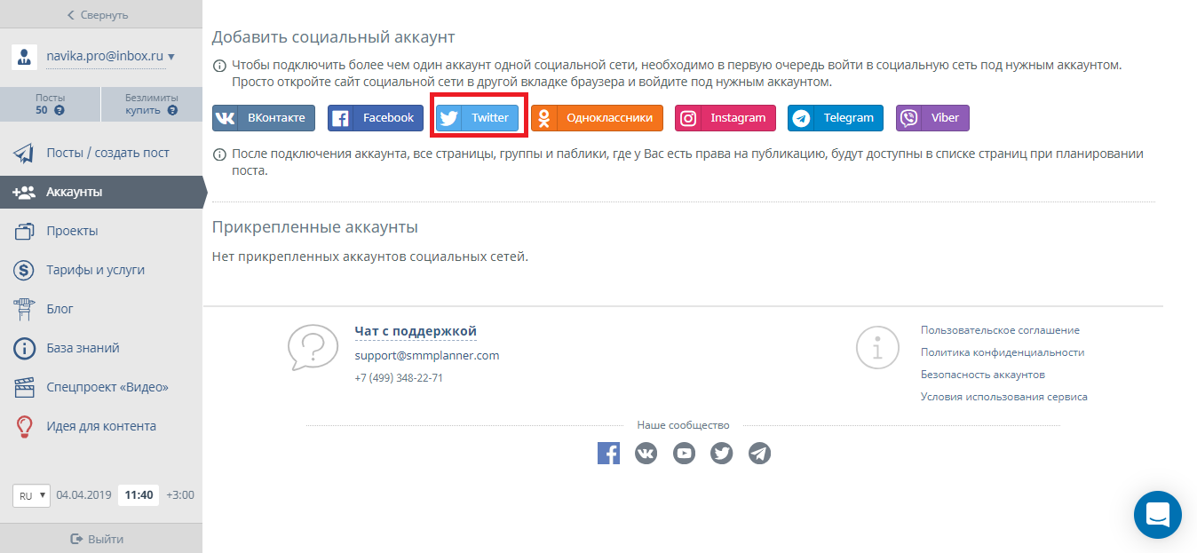 2. Подключаете аккаунт любой соцсети, в которой будете публиковать посты.