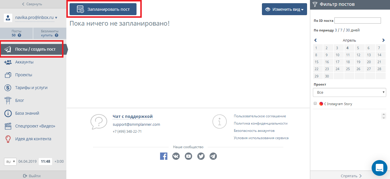 Шаг 4. Пока у нас ничего не запланировано и самое время, чтобы это исправить. Выбираем вкладку «Посты/создать пост» и нажимаем на кнопку «Запланировать пост».