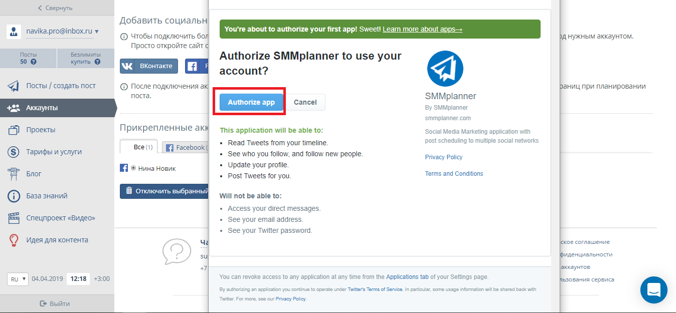 Дальше нажимаем на кнопку «Authorize app», чтобы сервис получил доступ к аккаунту.