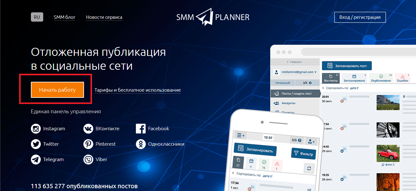 Шаг 1. Заходим на сайт https://smmplanner.com/ и нажимаем на кнопку «Начать работу».