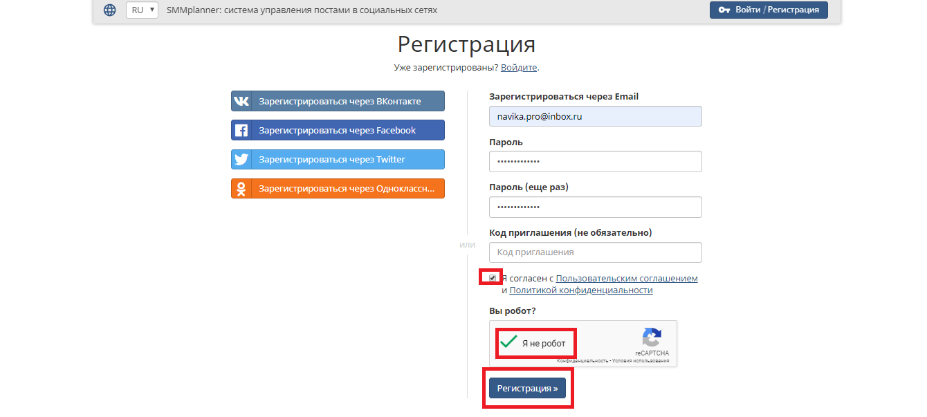Дальше указываем адрес электронной почты, пароль, ставим галочку, соглашаясь с пользовательским соглашением, и подтверждаем, что мы не роботы. После чего нажимаем на кнопку «Регистрация».