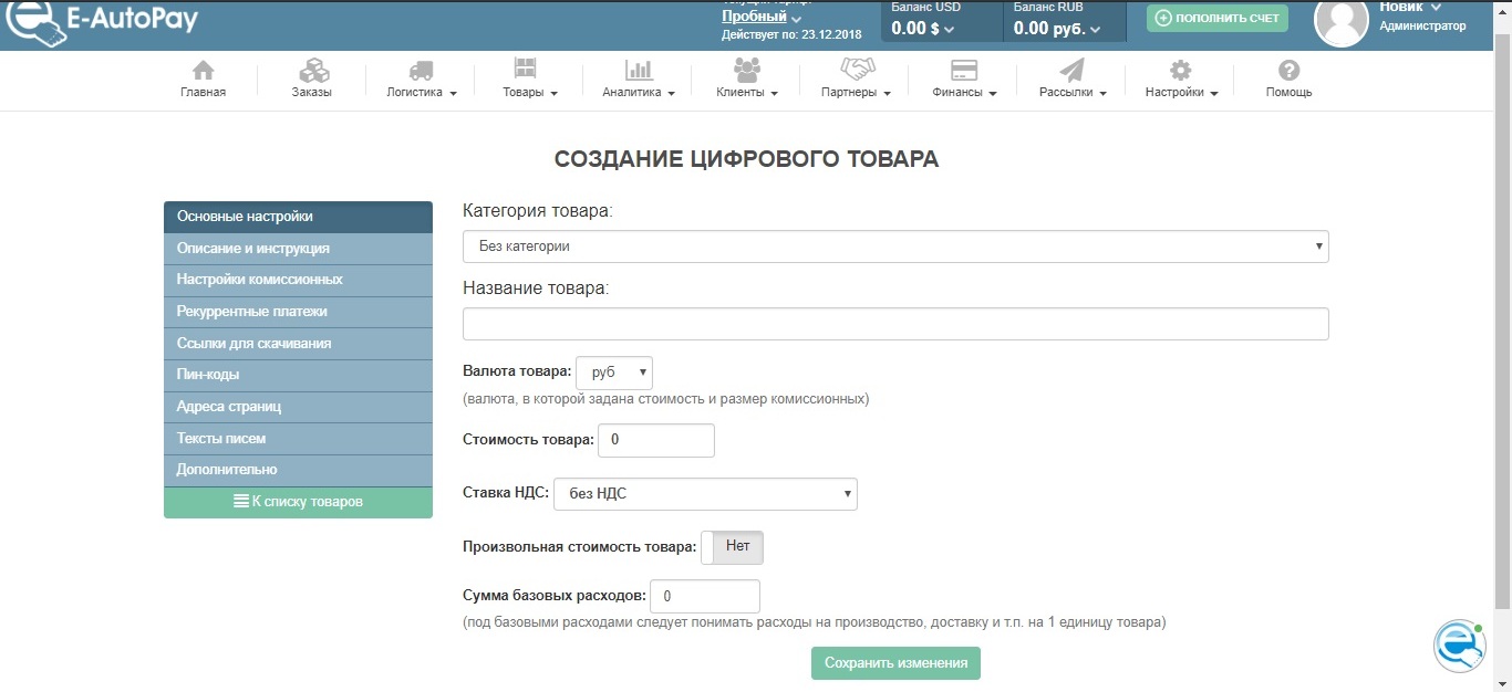 Для добавления, например, цифрового товара необходимо ввести его основные данные: категория (если вы уже создали свои категории), название, валюта, в которой задана стоимость, стоимость товара, ставка НДС (если есть), сумма базовых расходов (производство товара, его доставка и др.). Также здесь можно выбрать параметр «Произвольная стоимость товара». Это значит, что покупатель сможет сам указать ту сумму, за которую он хочет купить ваш продукт. После заполнения карточки товара нажимаем на кнопку «Сохранить изменения».
