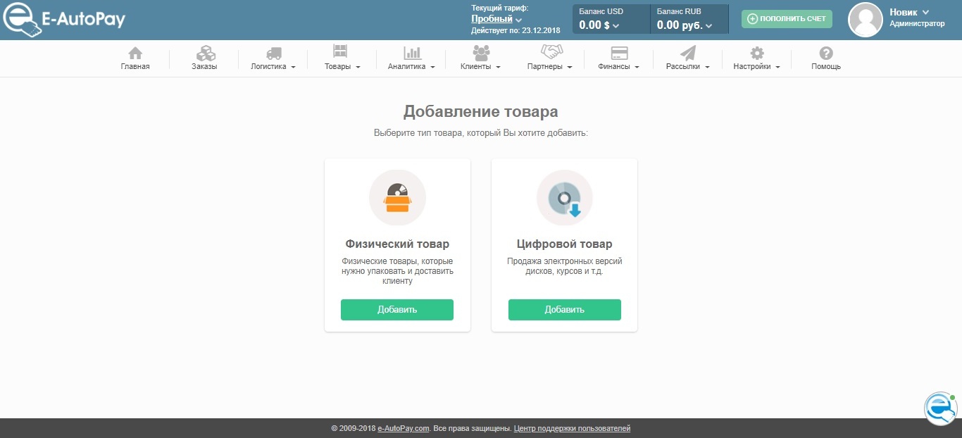 Выбираем тип товара. Физический — его нужно будет упаковать и доставить по адресу клиента. Цифровой — здесь потребуется ссылка для скачивания покупки. Нажимаем на кнопку «Добавить» под нужным типом товара.