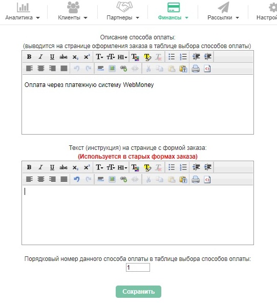 При необходимости можно отредактировать текстовое поле «Описание способа оплаты» и «Инструкцию на странице с формой заказа». Новая информация отразится у вас на сайте при выборе того или иного способа оплаты. После всех изменений нажимаем на кнопку «Сохранить».