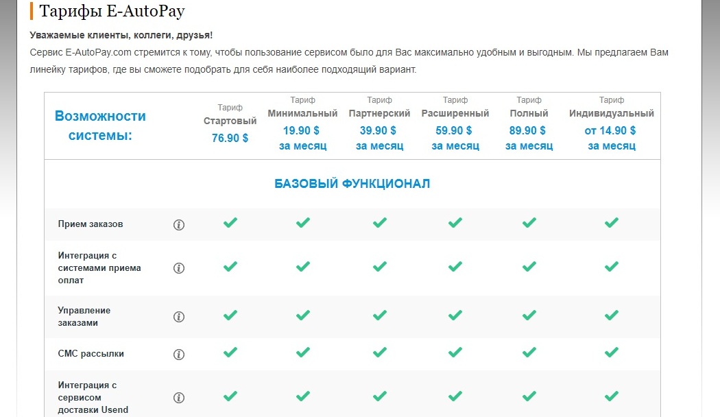 Отдельно стоит сказать про тариф «Стартовый». Он разработан специально для новичков и действует не более шести месяцев с момента подключения. Здесь доступны все функции сервиса E-AutoPay, кроме модуля «Сотрудники». В данном тарифе есть ограничение по достижению общей суммы заказов в 150 тысяч рублей. То есть, как только вы получите заказы на 150 тысяч рублей или пройдет шесть месяцев с момента подключения, необходимо будет выбрать другой тарифный план, который больше подойдет под особенности вашего бизнеса.