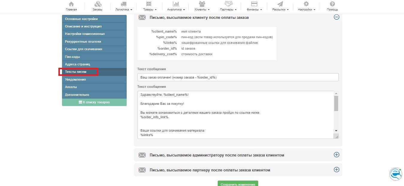 Шаг 16. Дальше нужно позаботиться о тексте письма, которое получит клиент после оплаты товара. Здесь обязательно должна быть ссылка для скачивания приобретенного товара. Тему и текст сообщения при желании можно отредактировать и дополнить важной информацией. После редактирования нажимаем на кнопку «Сохранить изменения».