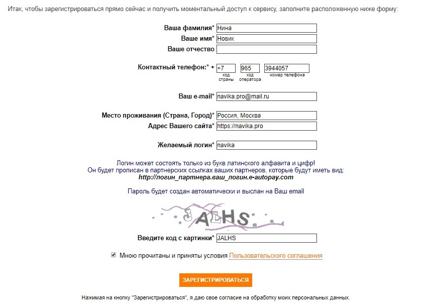 Обратите внимание на два важных момента. Первое: почта должна быть реальной, потому что на нее придет информация с вашим логином и паролем для входа. Второе: логин для входа в систему E-AutoPay вы сможете потом изменить, но логин, который вы выбираете при регистрации в поле «Желаемый логин», будет указываться в ссылках партнерских программ и изменить его потом будет нельзя.