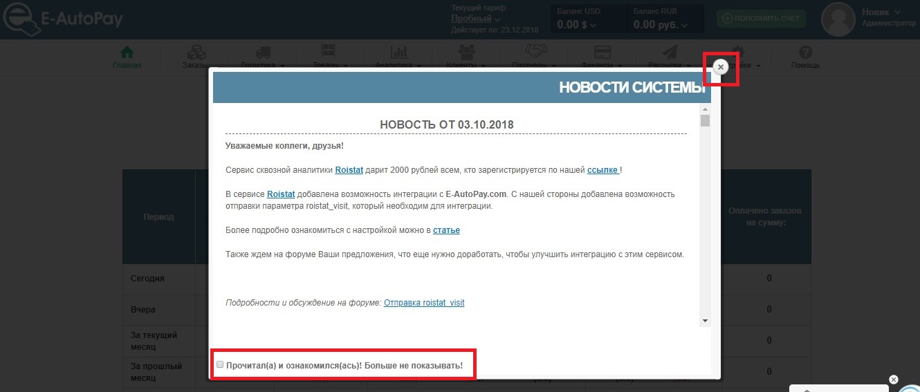 Шаг 7. Вы попадаете в аккаунт администратора, где всплывает информационное окно с последними новостями системы. Можно сразу же ознакомиться с информацией, после чего поставить галочку в поле «Прочитал(а) и ознакомился(ась)! Больше не показывать!» и нажать на крестик в верхнем правом углу. А можно вернуться к новостям позже.