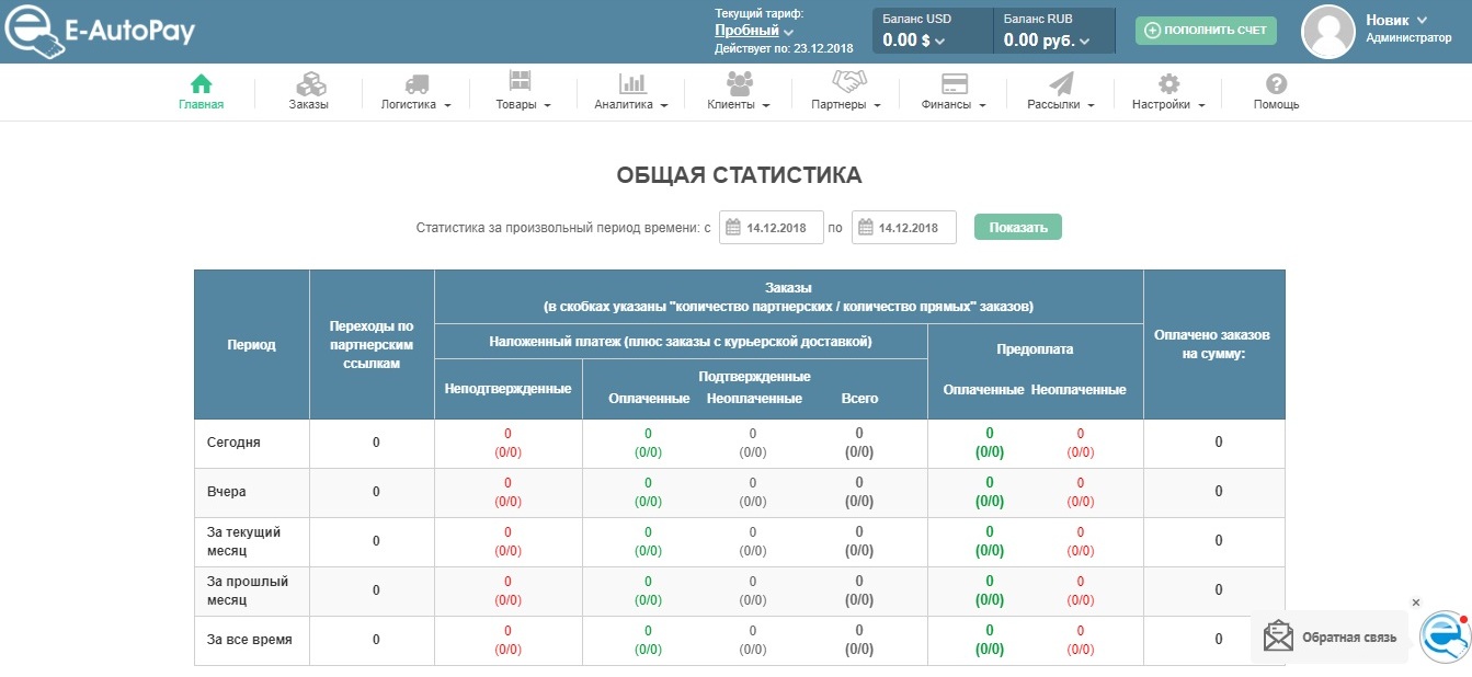 Сама регистрация в системе бесплатна. После активации аккаунта в течение 10 дней действует тариф «Пробный». В его рамках вы можете пользоваться всем функционалом сервиса, но с некоторым ограничением — вы сможете принимать не больше 100 заказов в сутки. Если данные условия доставляют сильные неудобства, рекомендуем сразу выбрать подходящий тариф: