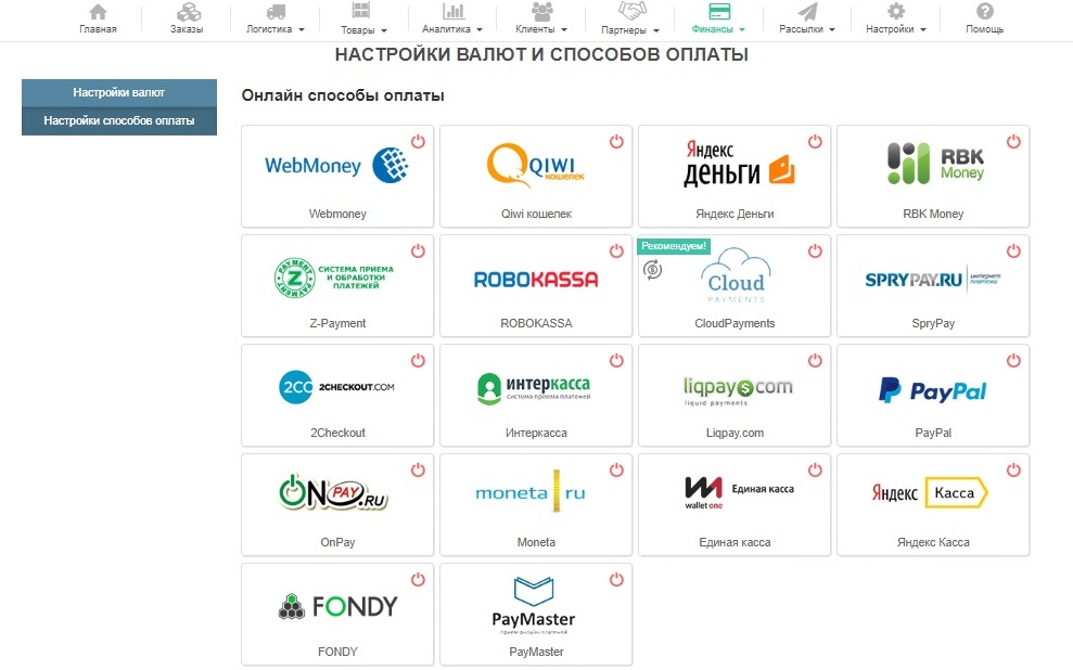 Шаг 9. На новой странице выбираем онлайн-способы оплаты, которые вы хотите использовать, — всего 18 вариантов. Можно подключить одну или сразу несколько платежных систем для удобства покупателей.