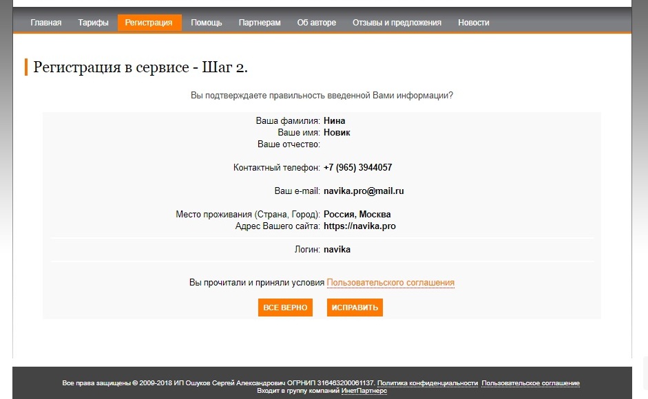 Шаг 3. Проверяем введенные данные для регистрации. Если заметили ошибку, нажмите на кнопку «Исправить» и внесите изменения. Если ошибок нет, жмем на кнопку «Все верно».