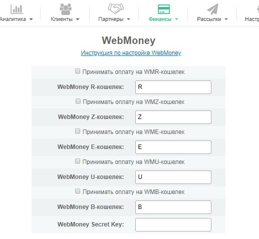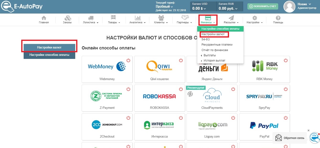 Начнем с настройки платежей и добавим способы оплаты. Стоит сказать, что сам сервис E-AutoPay не принимает никаких денег. Оплата происходит посредством интеграции с платежными системами. Для настройки нажимаем на вкладку «Финансы» и выбираем пункт «Настройки способов оплаты».