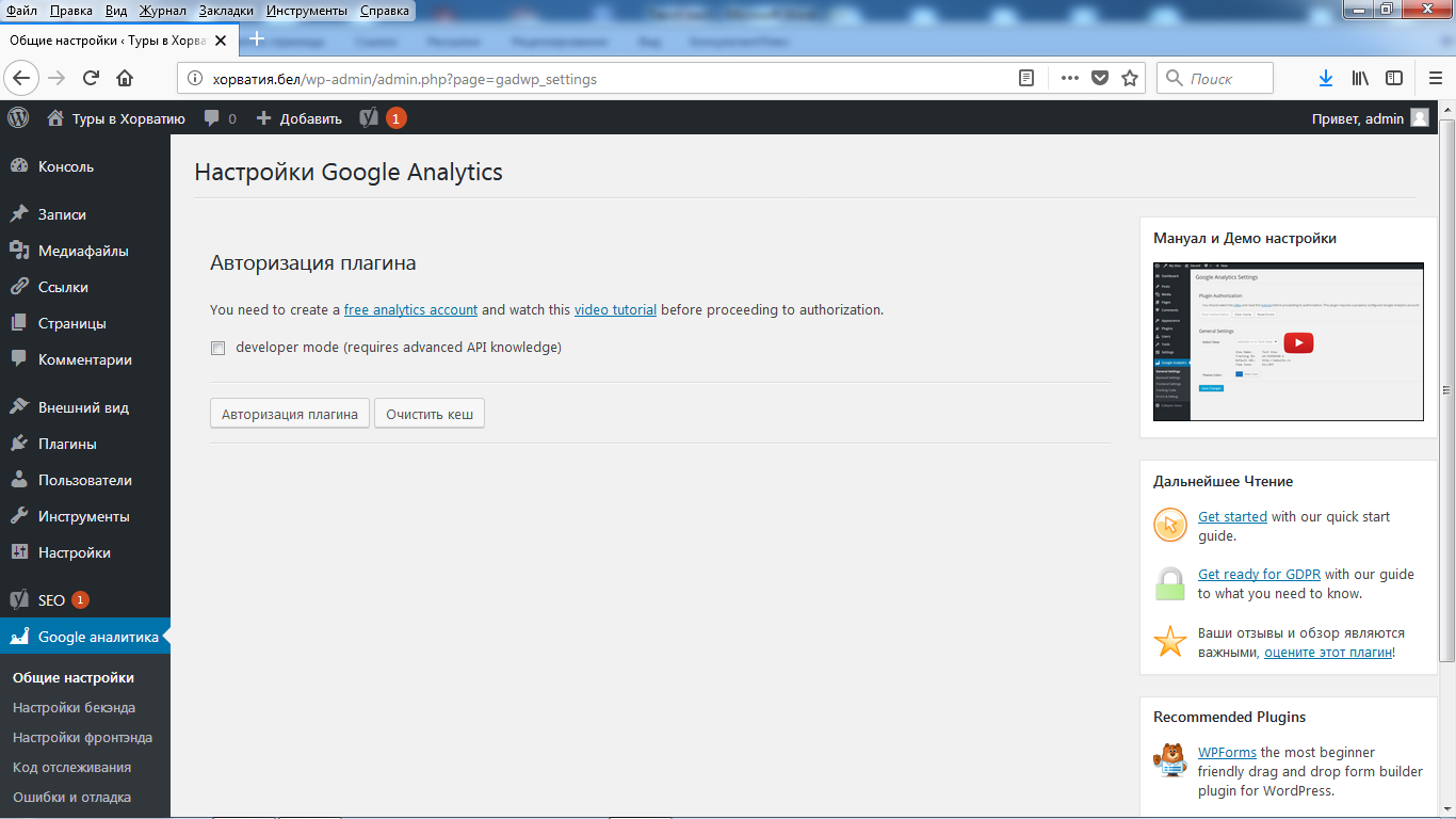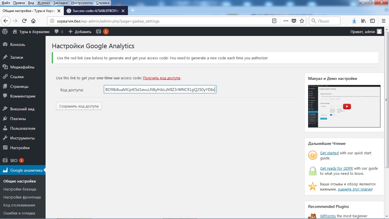 Внимание! Если у вас к этому электронному адресу уже привязаны другие сайты, может произойти ошибка. Тогда вам нужно будет вручную зайти в ваш аккаунт в Google Analytics, добавить туда новый ресурс, а потом уже получить код доступа и выбирать, к какому из ресурсов его привязать.
