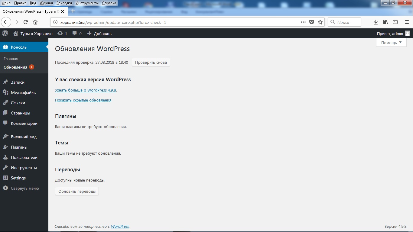 - Вход в административную панель. Проверка обновлений.