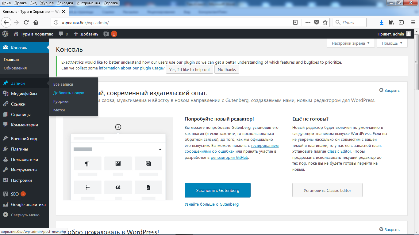 Нажмите в меню слева «Записи / Добавить новую».