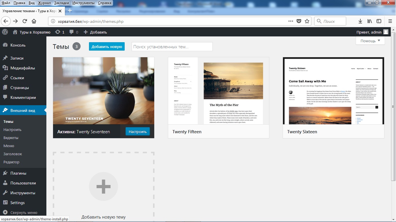 Откроется вот такое окно — темы, которые установлены в WordPress по умолчанию. Если вы только начинаете пользоваться WordPress, можете брать их для экспериментов, они просто и быстро настраиваются.