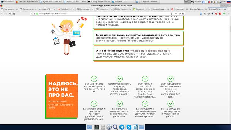 - составьте три-четыре образа, персоны. Например, Оксана, мама в декрете. По профессии бухгалтер, но не хочет выходить в офис на прежнее место работы. Цель: хочет найти дело по душе и приносящее доход, не выходя из дома. Трудности: ограниченный бюджет на обучение, мало времени на учебу (2–3 часа в день во время сна ребенка). Наше решение: обозначаем на лендинге, что на курсе можно попробовать несколько удаленных профессий и выбрать свое, при этом в течение дня обучение займет немного времени, и есть разные варианты пакетов, в том числе пакет «Самостоятельный» по очень бюджетной цене;