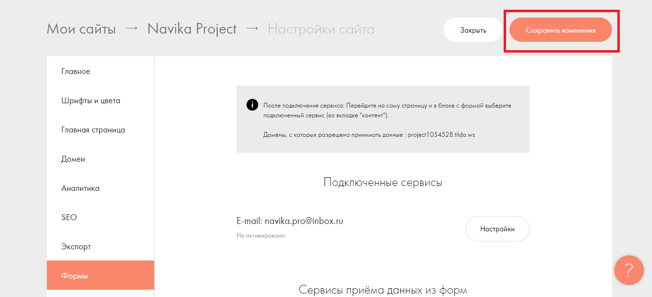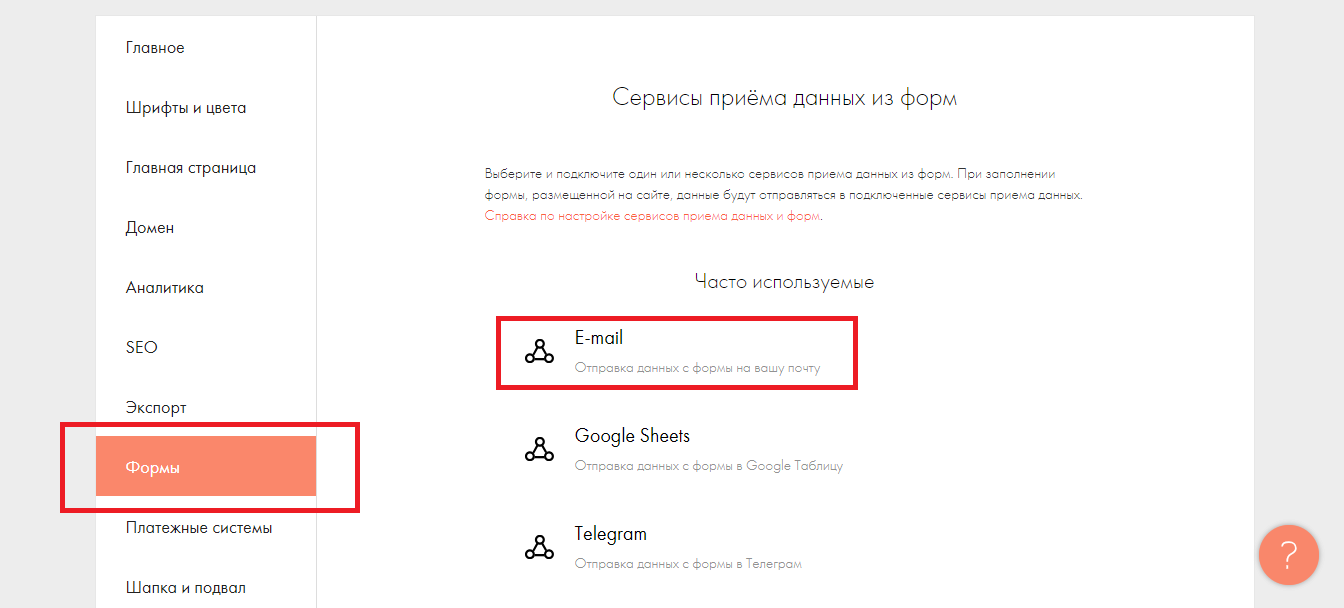 Дальше можно настроить сервисы приема данных из форм. Например, чтобы посетитель мог оставить сообщение в специальной форме на сайте, а оно бы пришло вам на почту. Для этого выберете вкладку «Формы» и опцию «E-mail».