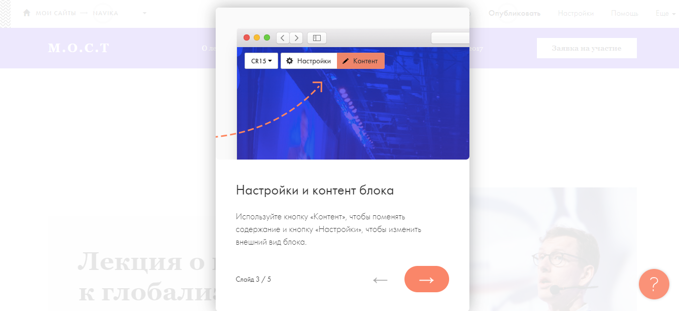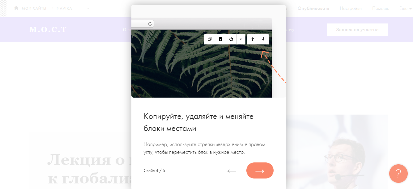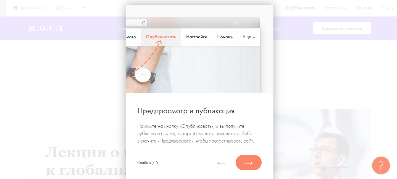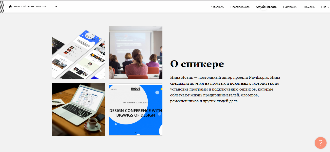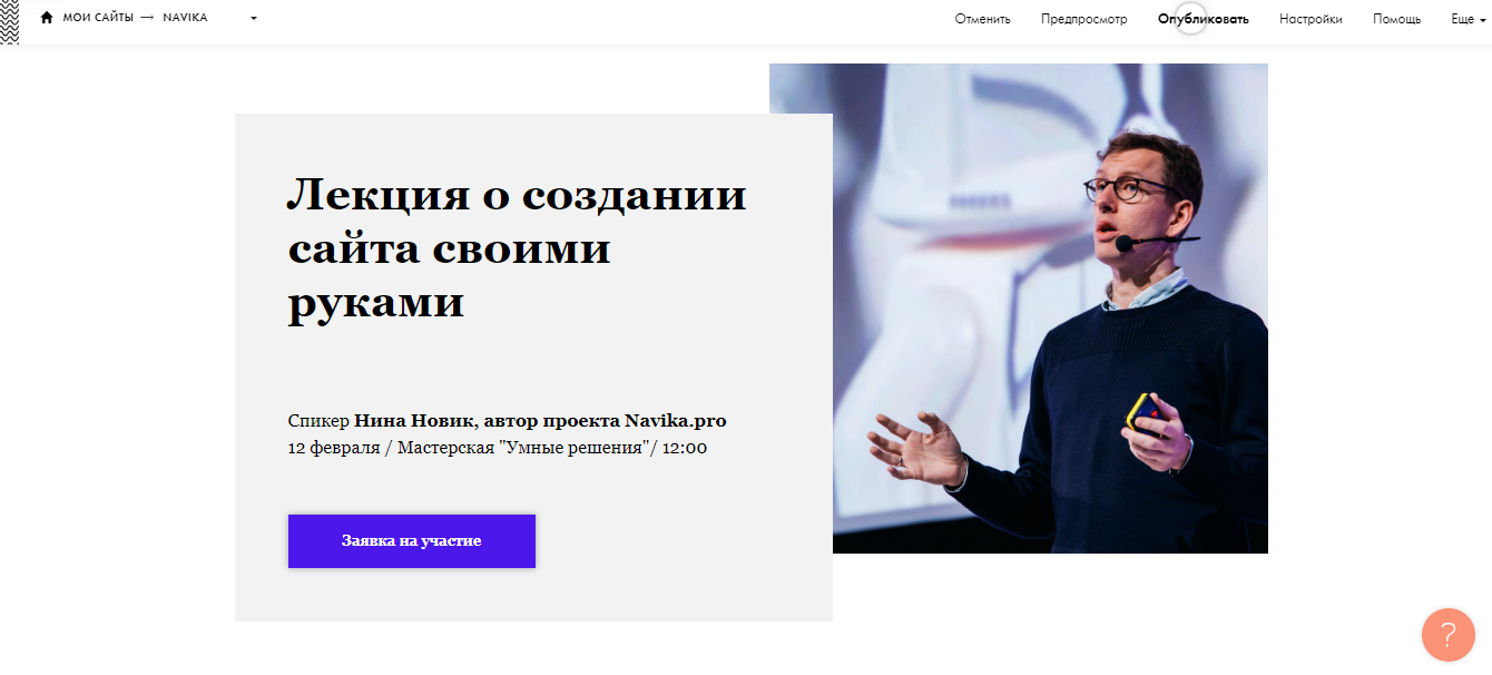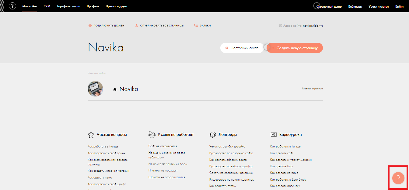 В любой момент вы сможете внести в свой сайт необходимые изменения через личный кабинет, и они сразу же отобразятся в онлайне. Не расстраивайтесь, если в первый раз получилось неидеально. Чтобы усовершенствовать свои навыки в создании сайтов, сервис предлагает собственные уроки и статьи, а также вебинары. Все это можно найти в правом верхнем углу в личном кабинете.