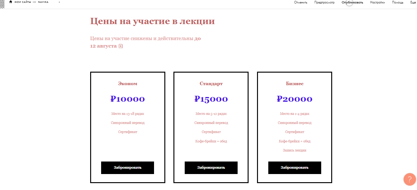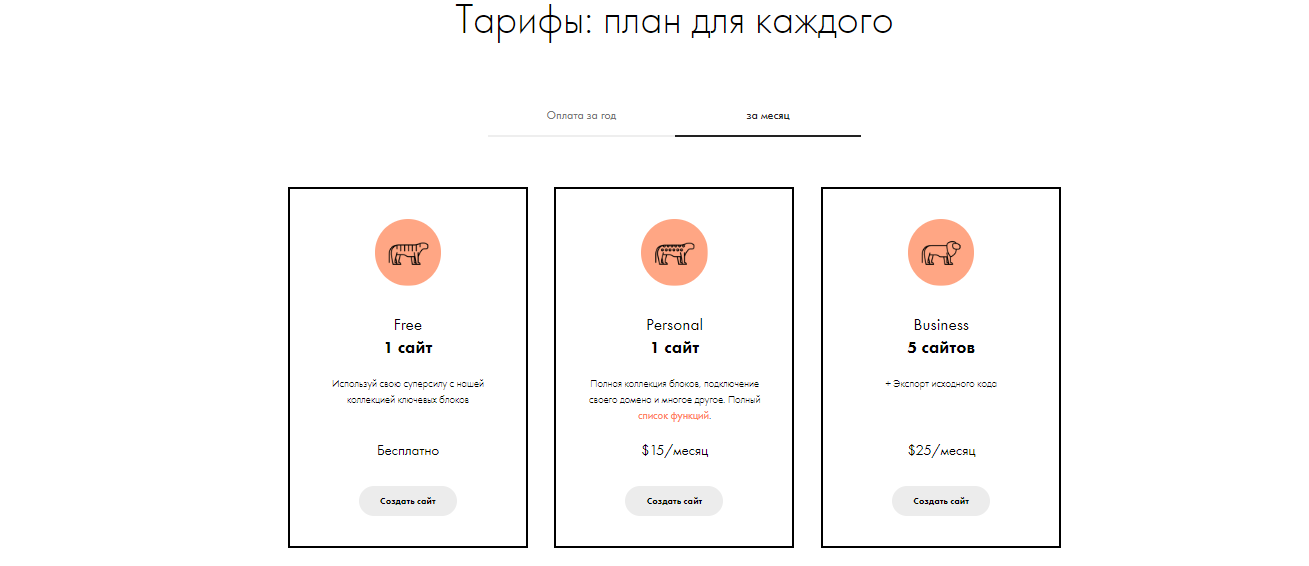 Создание сайта и использование ключевых блоков на тарифе Free не стоит ни копейки. Правда, здесь есть свои неудобства, как ограниченность функционала, так и невозможность подключения уникального домена. Поэтому если ключевых блоков вам недостаточно или важен персональный домен, можно выбрать один из двух тарифов: