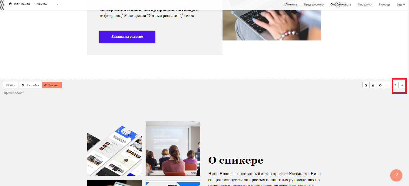 Чтобы менять местами блоки информации, нажимайте на стрелочки в правом верхнем углу каждого блока.