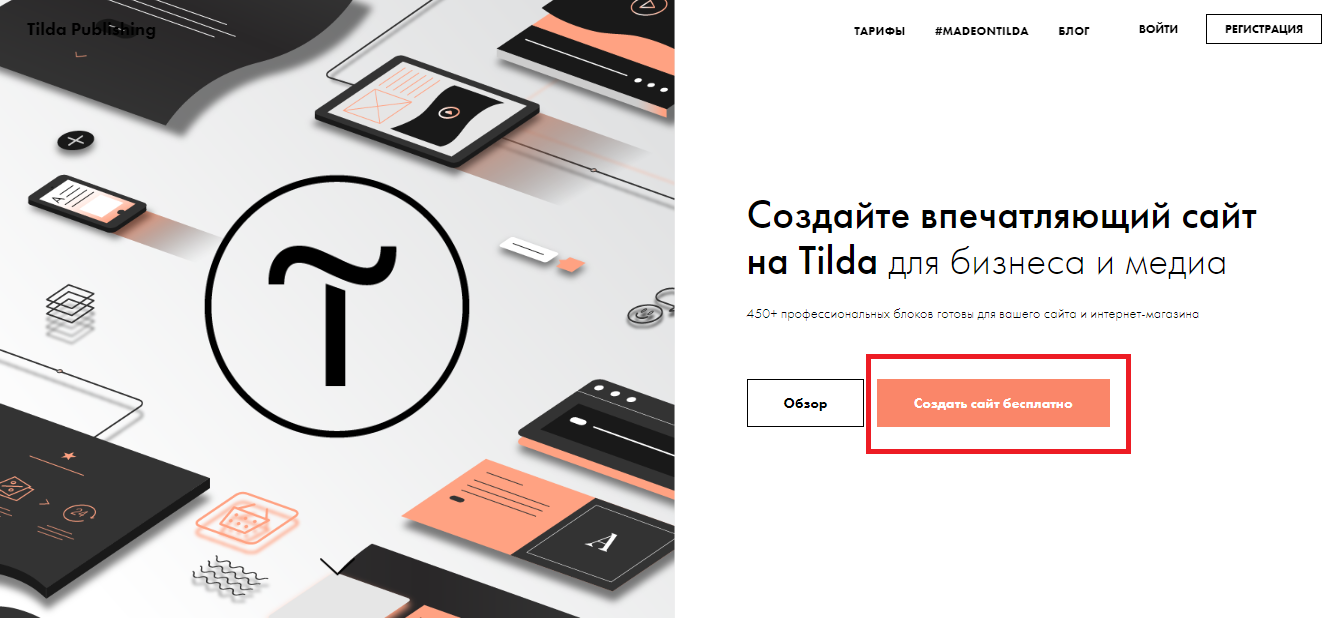 Шаг 1. Заходим на главную страницу сервиса https://tilda.cc/ru и нажимаем на кнопку «Создать сайт бесплатно».