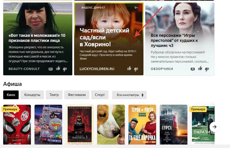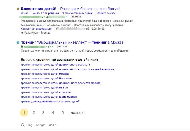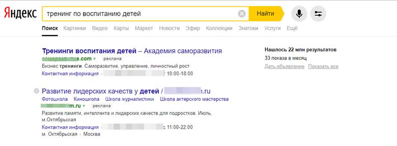 По типам показа она делится на две крупные категории: поисковую и тематическую. Первая подразумевает объявления, относящиеся к теме вашего поискового запроса. Вторая — когда предлагаемый товар входит в сферу возможных интересов пользователя. Например, мы запрашиваем в «Яндексе» тренинги по воспитанию детей: объявления, совпадающие с этим запросом, — это поисковая реклама, а иппотерапия для детей — тематическая.