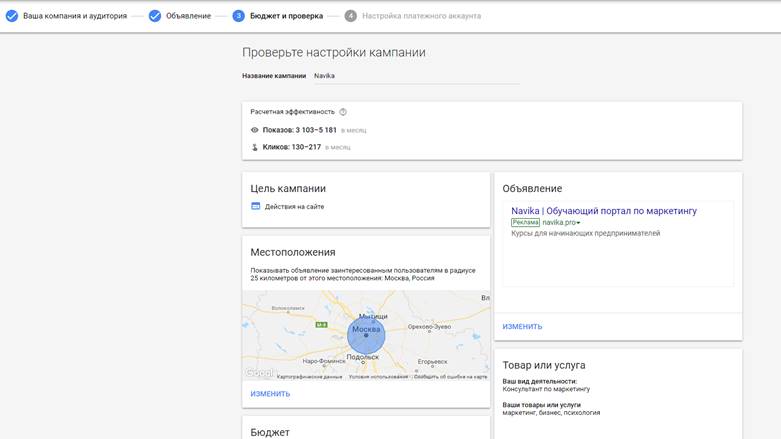Заполняете все необходимые данные аккаунта, устанавливаете бюджет, настраиваете платежный аккаунт и отправляете объявление на модерацию.