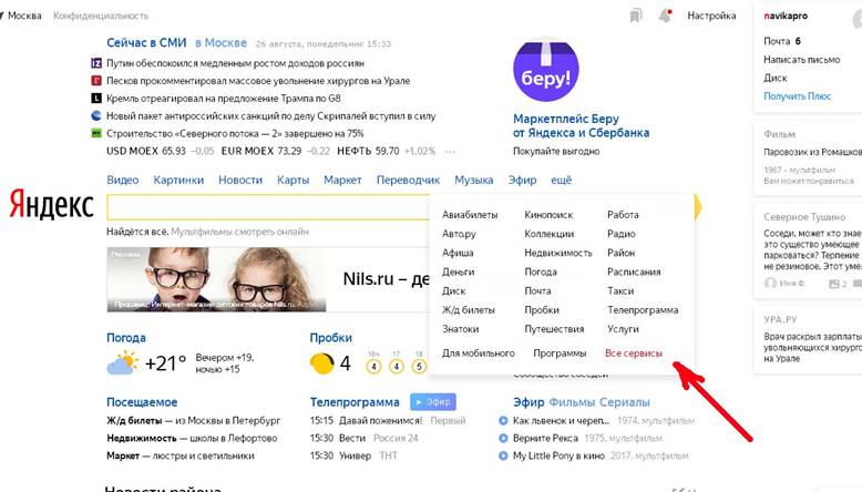 Авторизовавшись на «Яндексе», выбирайте в меню «Яндекса» «все сервисы».