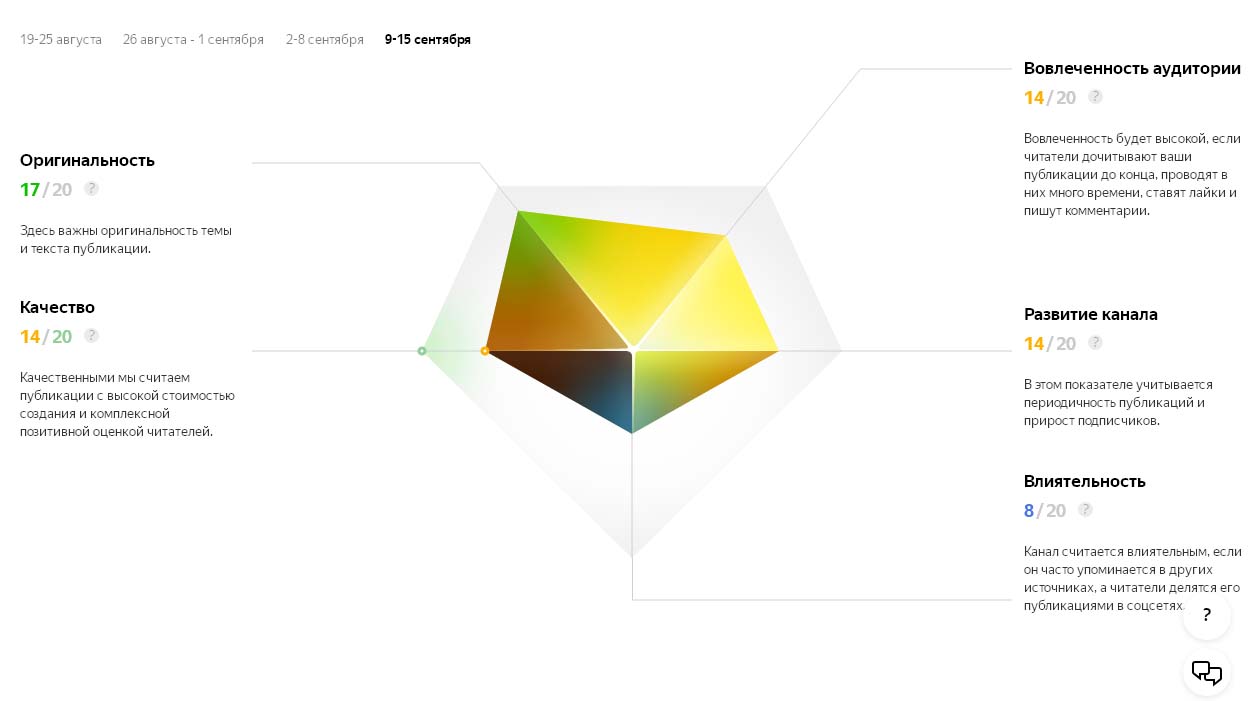 Чем ближе каждый из пяти параметров к 20 баллам, тем лучше с точки зрения «Яндекса».