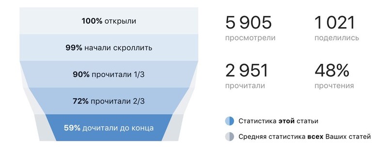 Кроме прочего, вы можете видеть, сколько людей начали и не закончили читать, сколько — дочитали, сколько — поделились материалом.