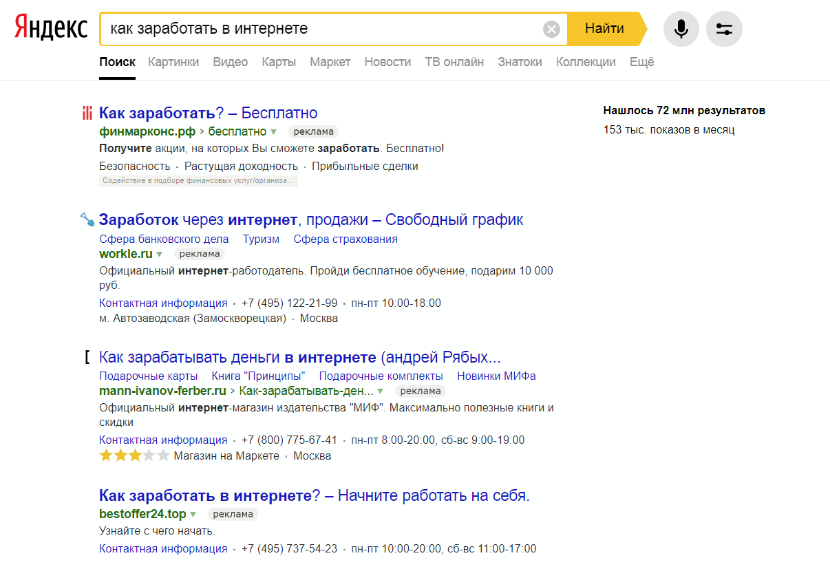 «Как заработать в Интернете», поисковая выдача «Яндекса»