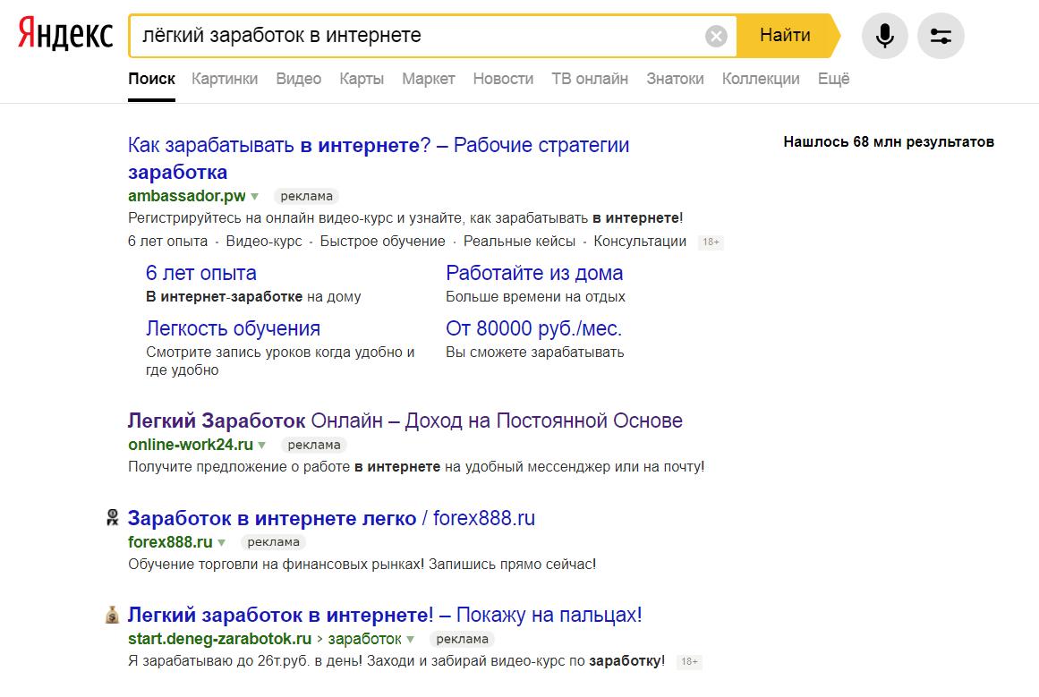 Фраза «легкий заработок» тоже дает огромную выдачу