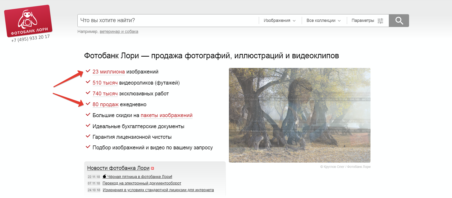 Внимательно изучите условия сотрудничества, правила выплат, с одной стороны, и свои возможности — с другой. Важная информация может лежать на поверхности. Вот, например, скриншот первой страницы отечественного фотобанка «Лори». Обратите внимание: в банке более 23 миллионов изображений и только 80 продаж ежедневно.