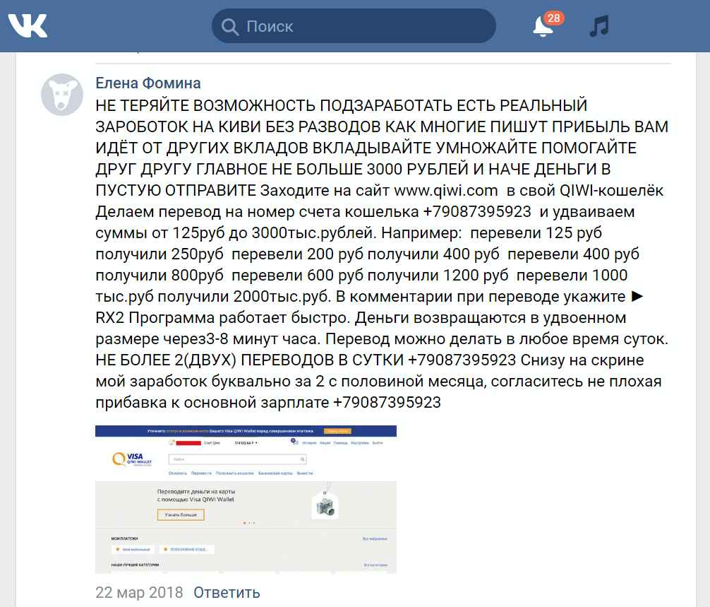 Способ заработка, о котором сейчас пойдет речь, прост и эффективен: переводите некоторую сумму на определенный «Киви-кошелек», а спустя несколько минут деньги возвращаются вдвойне. Все просто и эффективно, как в трюках Дэвида Копперфильда. Скупые пояснения намекают, что доход обеспечивает некий «алгоритм». Иногда в комментариях к переводу требуют указать «специальный программный код». Вот скриншот из группы «ВКонтакте»:
