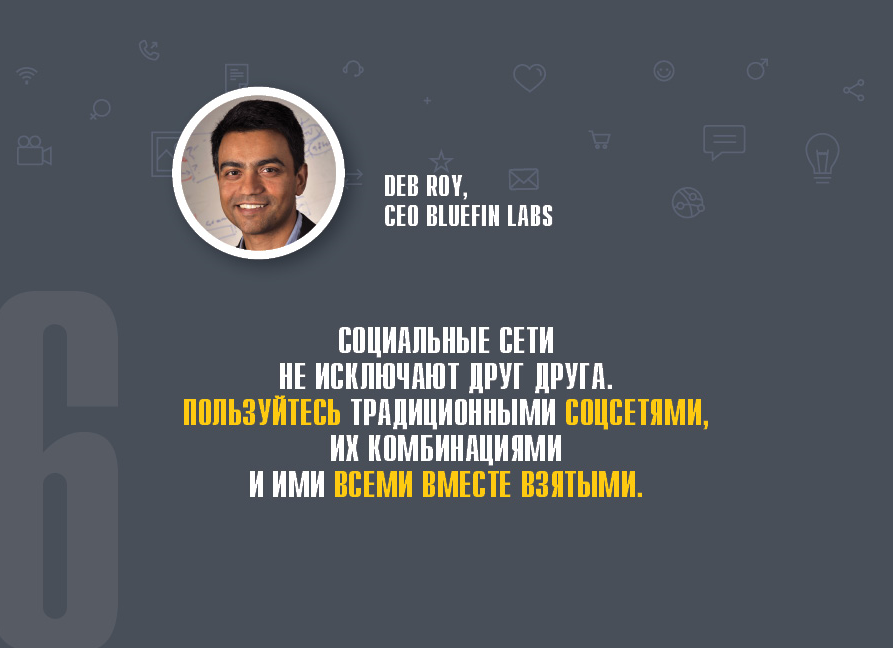- «Социальные сети не исключают друг друга. Пользуйтесь традиционными соцсетями, их комбинациями и ими всеми, вместе взятыми» (Deb Roy, CEO Bluefin Labs).